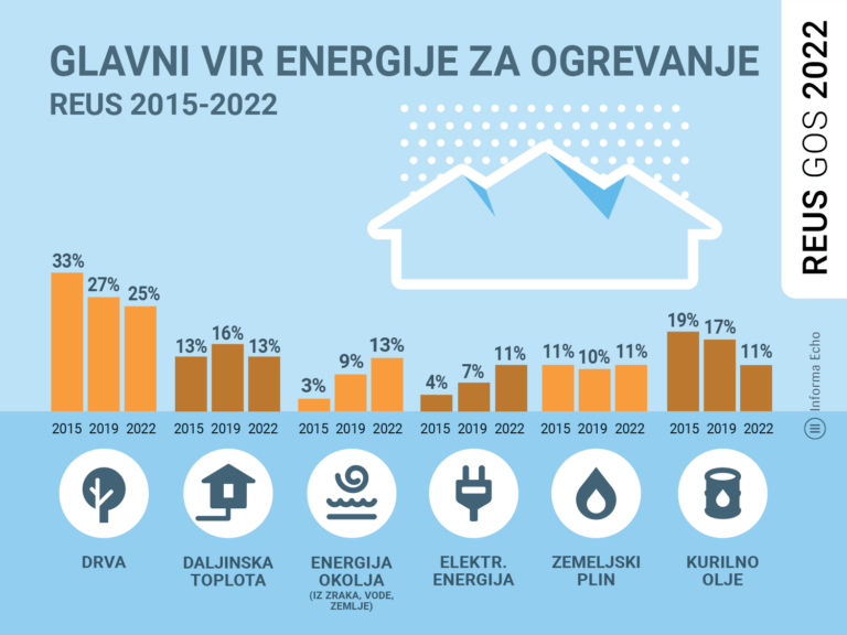Raziskava prikazuje tudi gibanje uporabe glavnega energenta za ogrevanje skozi obdobje od 2015 do 2022. V tem času se je za 10 odstotnih točk povečala uporaba energije okolja, na drugi strani pa se je za 8 odstotnih točk zmanjšala uporaba drv ter kurilnega olja.