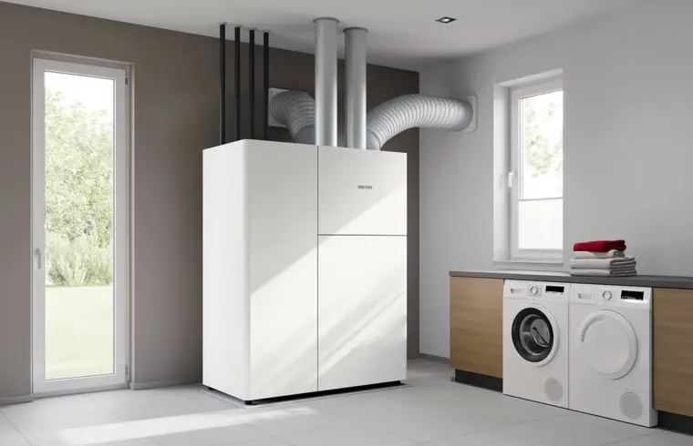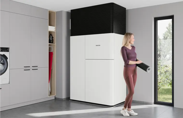 Notranja toplotna črpalka zrak-voda s prezračevanjem LWZ Premium je v celoti nameščena v notranjosti hiše in ne potrebuje zunanje enote. Na zgolj 1,1 m² združuje ogrevanje, hlajenje, pripravo tople vode in prezračevanje, zato je idealna rešitev za manjše pomožne prostore. Ker je sistem skrit v notranjosti, vrt ostaja nedotaknjen, delovanje pa je izjemno tiho in nemoteče za vas in okolico.